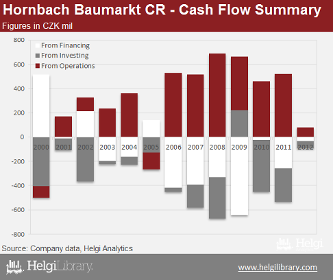 With ROE of nearly 14% and net debt accounting for only 37% of Company's equity at the end of 2012, Hornbach CR is still decently profitable and little indebted Company