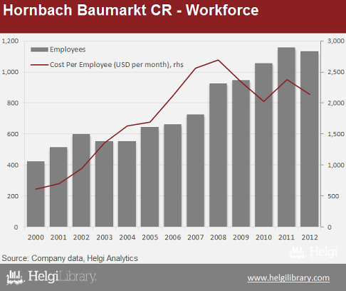 In 2012, the Company had 1,134 employees in the Czech Republic, twice as many as a decade ago. The average staff cost reached USD 2,144 per employee and month, again twice as much as 10 years ago
