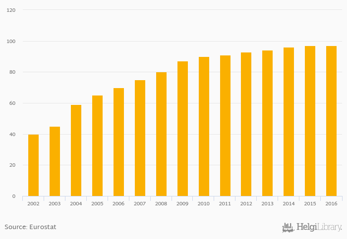 Households with Internet Access (As % of Total) rose 0% to 97.0% in Luxembourg in 2016, according to Eurostat.