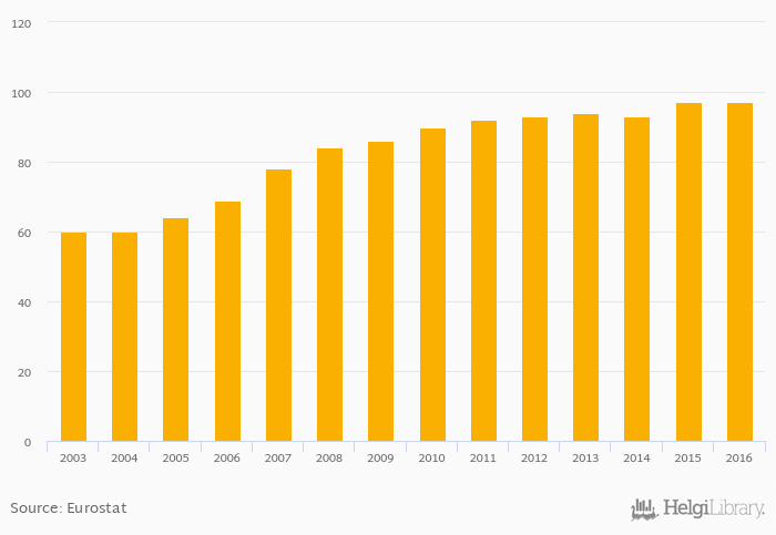 Households with Internet Access (As % of Total) rose 0% to 97.0% in Norway in 2016, according to Eurostat.