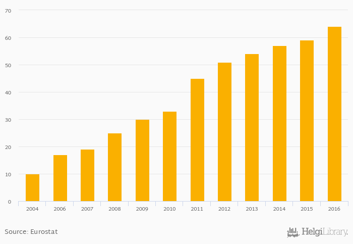 Households with Internet Access (As % of Total) rose 8.47% to 64.0% in Bulgaria in 2016, according to Eurostat.