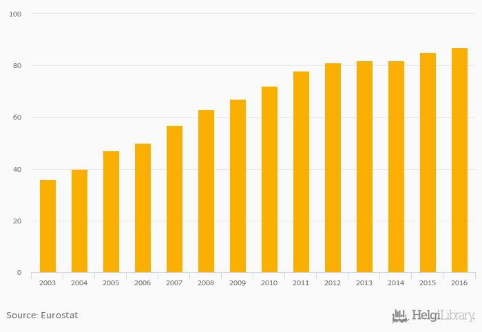 Households with Internet Access (As % of Total) rose 2.35% to 87.0% in Ireland in 2016, according to Eurostat.
