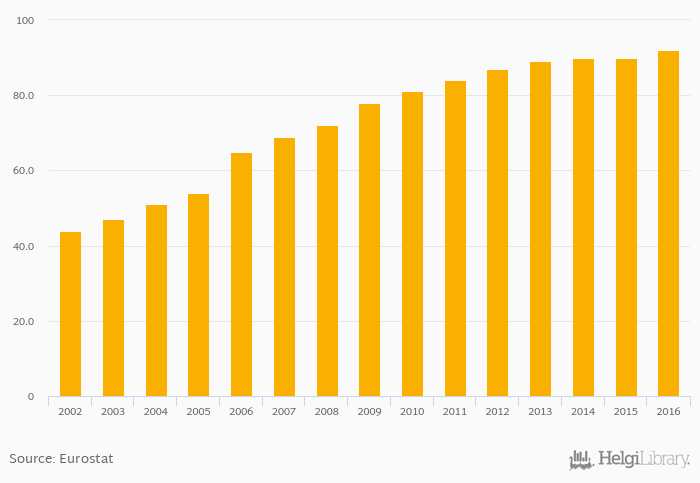Households with Internet Access (As % of Total) rose 2.22% to 92.0% in Finland in 2016, according to Eurostat.