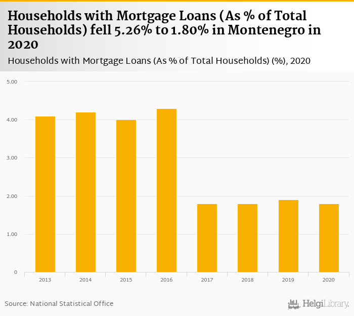 Number of households with mortgage loans as a percentage of total households fell 5.26% to 1.80% in Montenegro in 2020, according to the National Statistical Office.