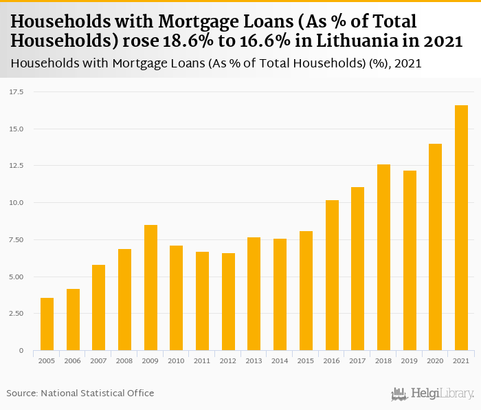 Number of households with mortgage loans as a percentage of total households rose 18.6% to 16.6% in Lithuania in 2021, according to the National Statistical Office.
