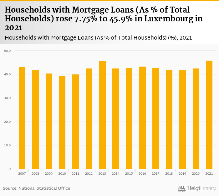 Number of households with mortgage loans as a percentage of total households rose 7.75% to 45.9% in Luxembourg in 2021, according to the National Statistical Office.