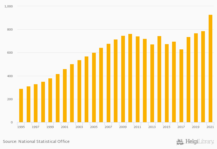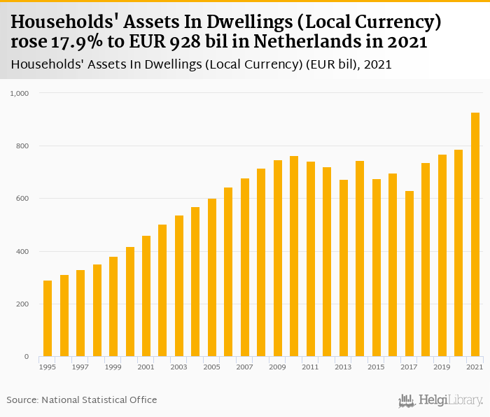 Historically, households' assets in dwellings in Netherlands reached an all time high of EUR 928 bil in 2021 and an all time low of EUR 289 bil in 1995.