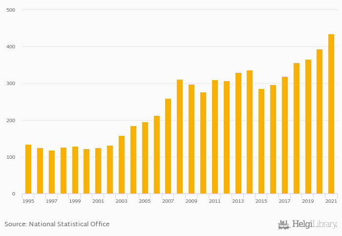 Historically, households' assets in dwellings in Finland reached an all time high of USD 434 bil in 2021 and an all time low of USD 118 bil in 1997.