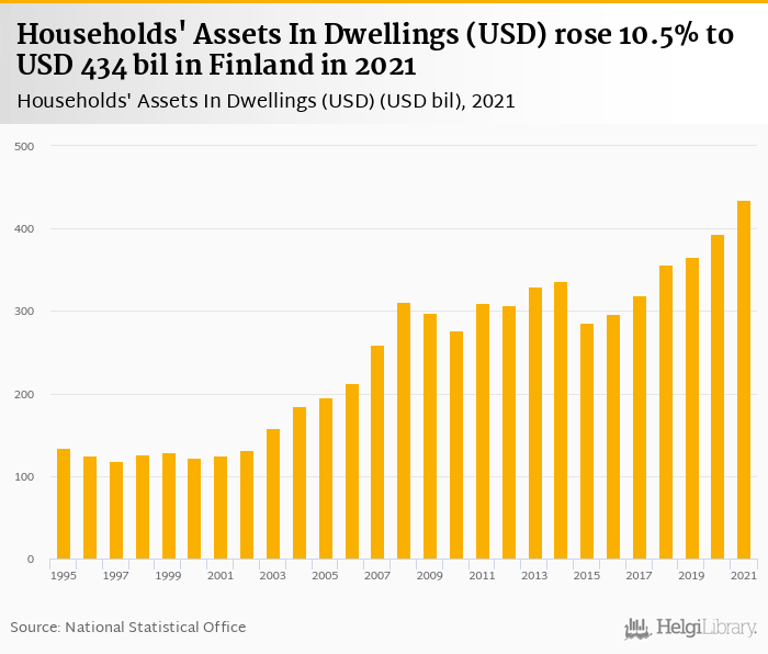 Households' assets in dwellings rose 10.5% to USD 434 bil in Finland in 2021, according to OECD.