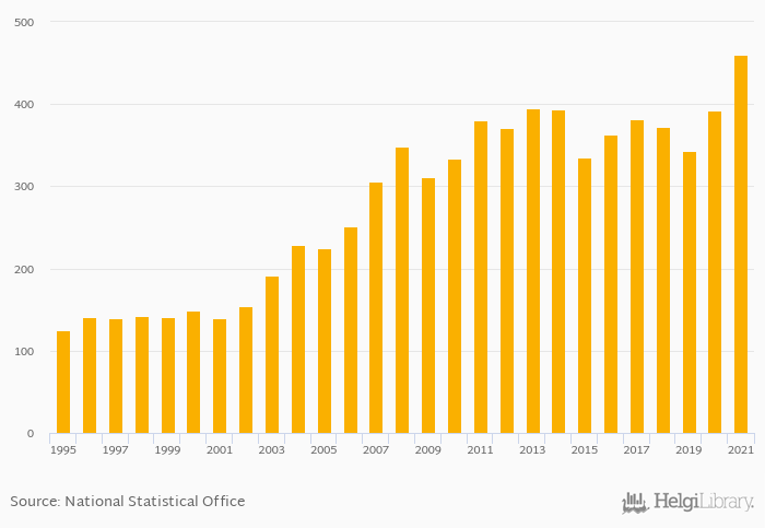 Historically, households' assets in dwellings in Sweden reached an all time high of USD 460 bil in 2021 and an all time low of USD 125 bil in 1995.