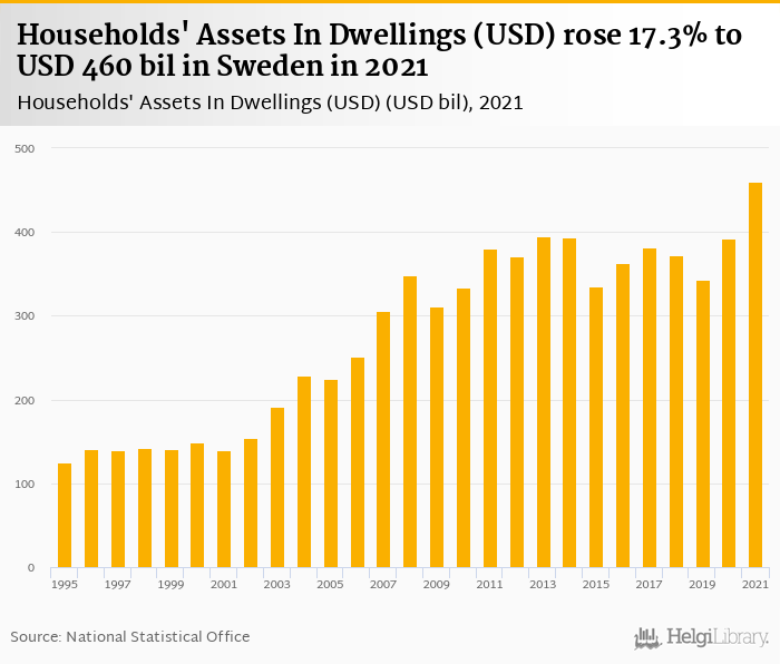 Households' assets in dwellings rose 17.3% to USD 460 bil in Sweden in 2021, according to OECD.
