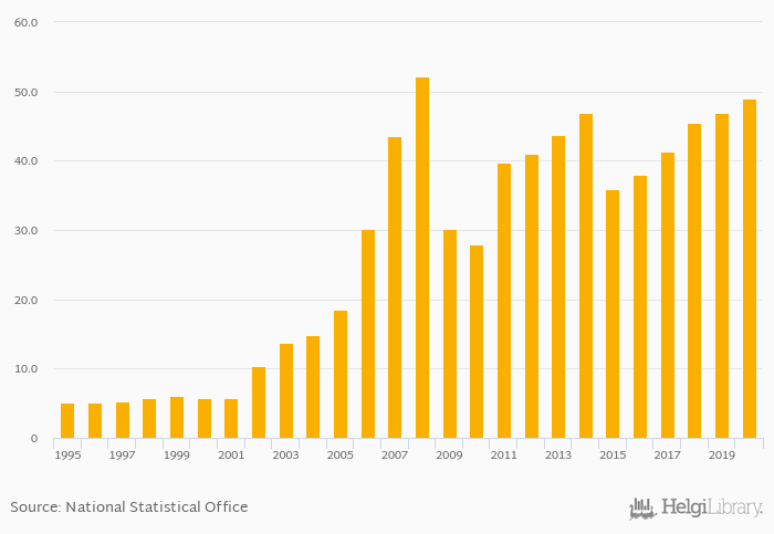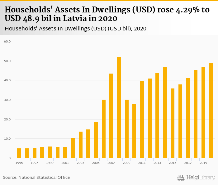 Households' assets in dwellings rose 4.29% to USD 48.9 bil in Latvia in 2020, according to OECD.