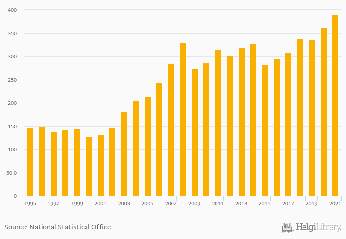 Historically, households' assets in dwellings in Denmark reached an all time high of USD 389 bil in 2021 and an all time low of USD 129 bil in 2000.
