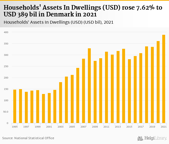 Households' assets in dwellings rose 7.62% to USD 389 bil in Denmark in 2021, according to OECD.