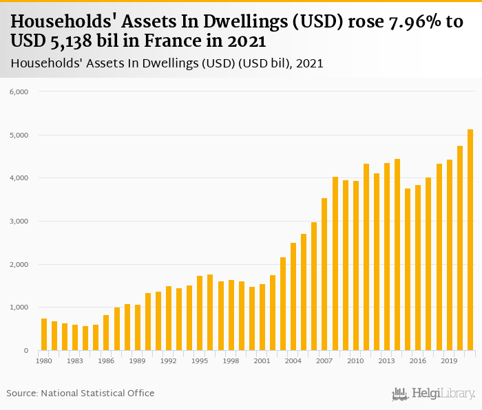 Households' assets in dwellings rose 7.96% to USD 5,138 bil in France in 2021, according to OECD.