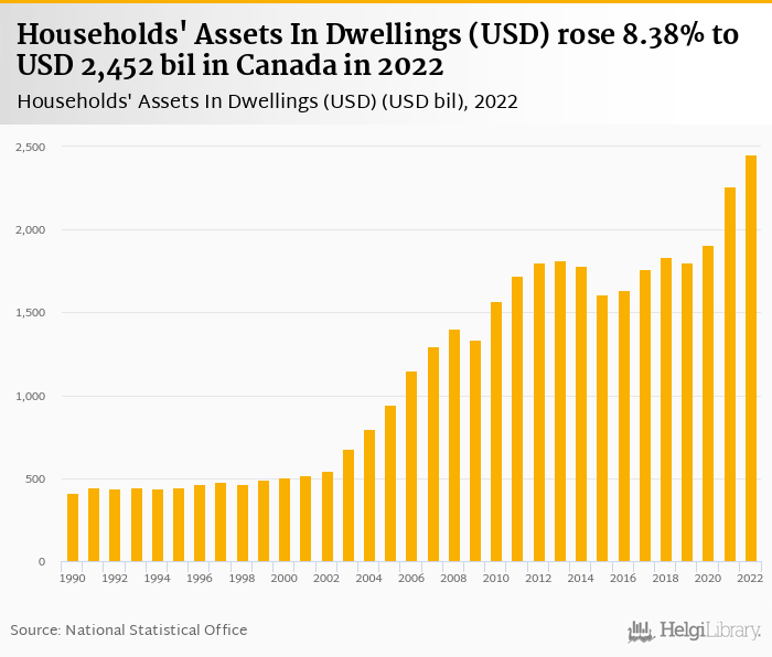 Households' assets in dwellings rose 8.38% to USD 2,452 bil in Canada in 2022, according to OECD.