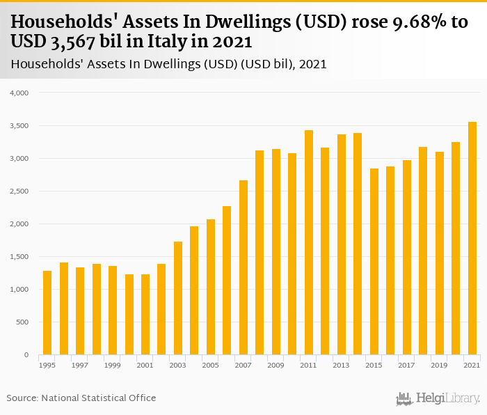 Households' assets in dwellings rose 9.68% to USD 3,567 bil in Italy in 2021, according to OECD.