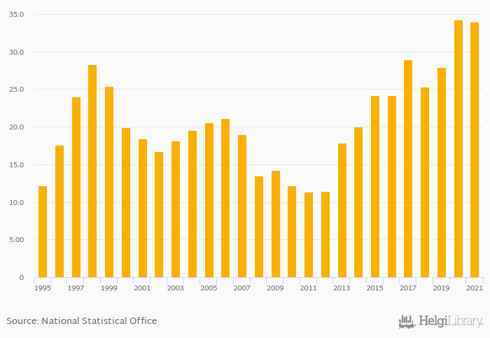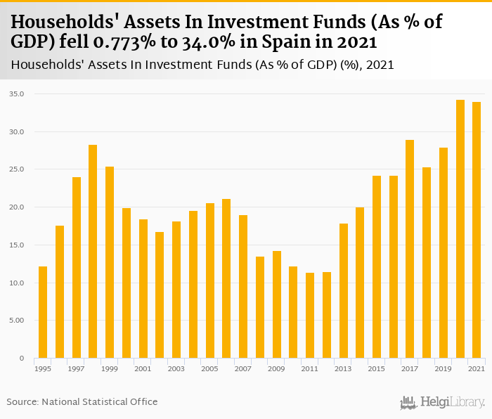Households' assets in investment funds as of GDP fell 0.773% to 34.0% in Spain in 2021, according to OECD.