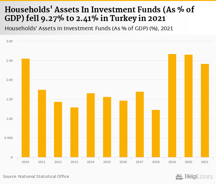 Households' assets in investment funds as of GDP fell 9.27% to 2.41% in Turkey in 2021, according to OECD.