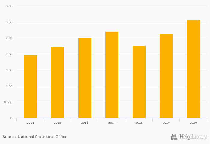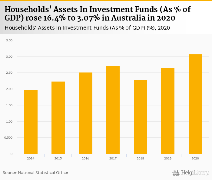 Households' assets in investment funds as of GDP rose 16.4% to 3.07% in Australia in 2020, according to OECD.