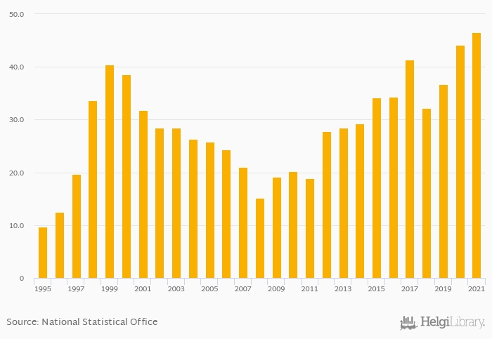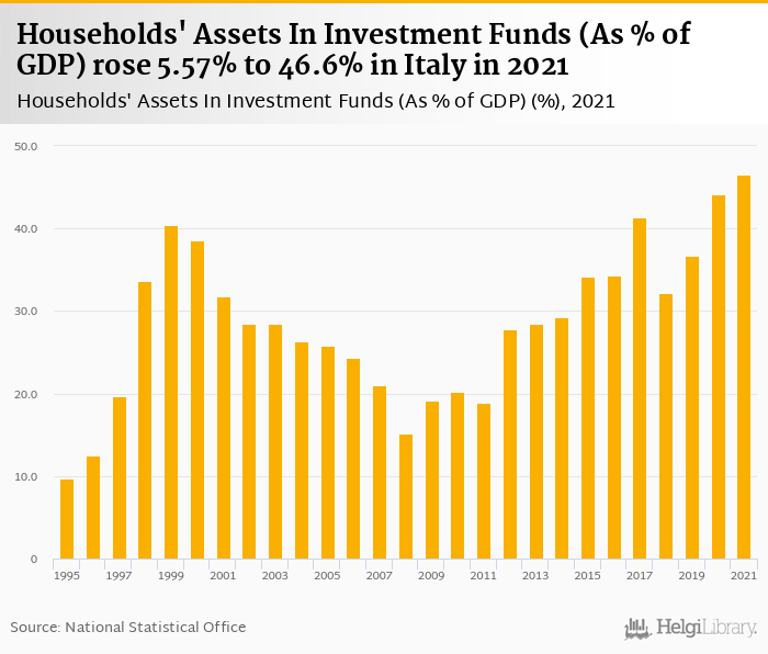 Households' assets in investment funds as of GDP rose 5.57% to 46.6% in Italy in 2021, according to OECD.
