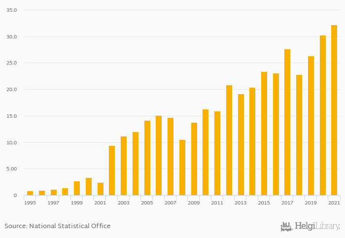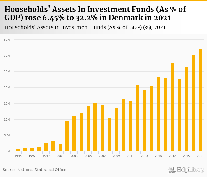 Households' assets in investment funds as of GDP rose 6.45% to 32.2% in Denmark in 2021, according to OECD.