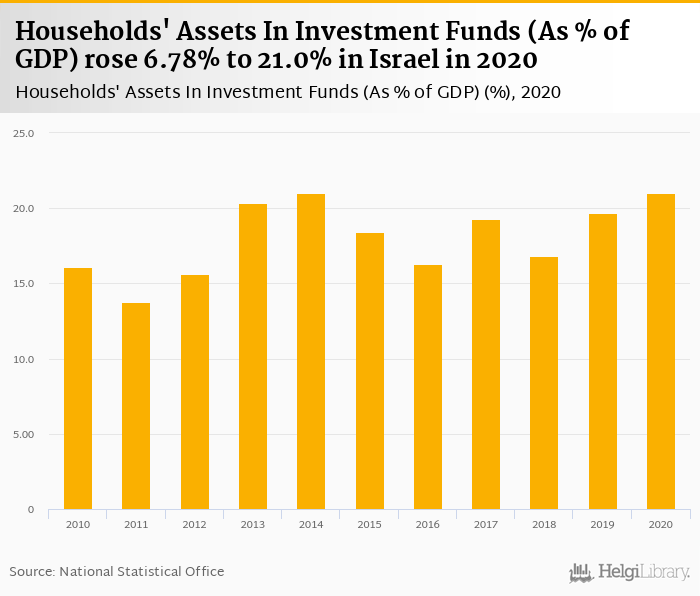 Households' assets in investment funds as of GDP rose 6.78% to 21.0% in Israel in 2020, according to OECD.