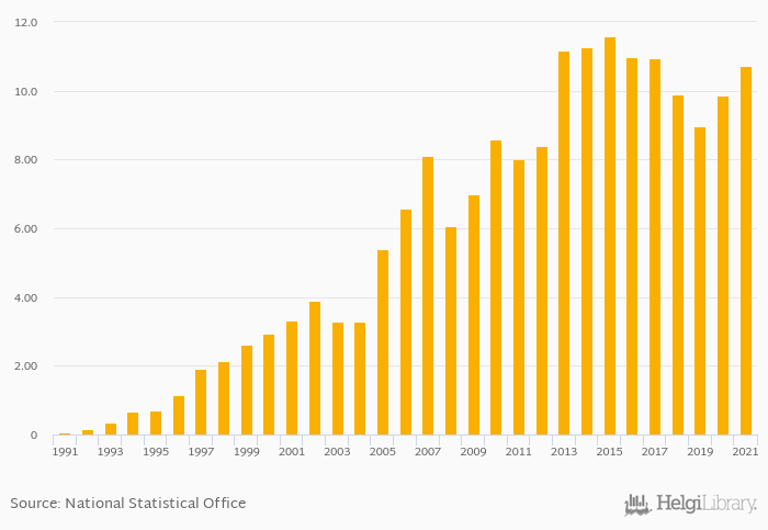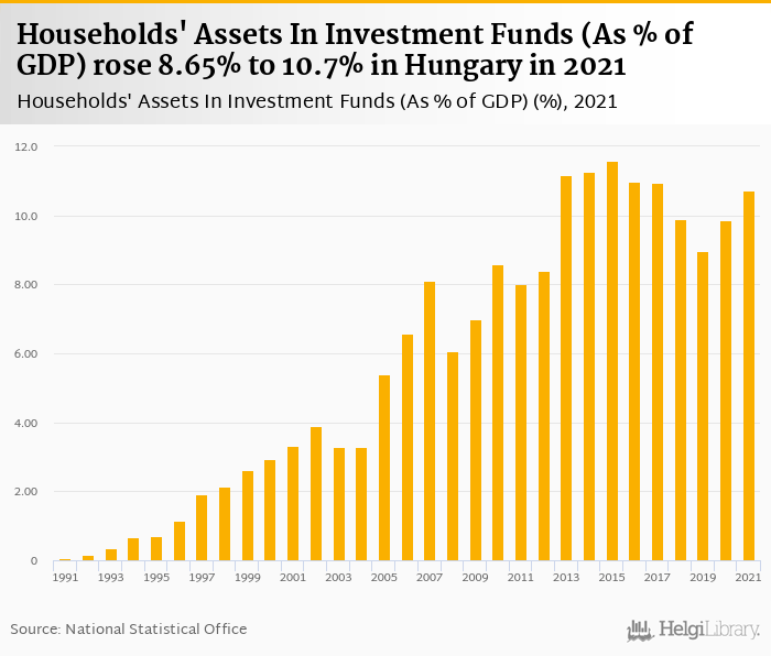 Households' assets in investment funds as of GDP rose 8.65% to 10.7% in Hungary in 2021, according to OECD.