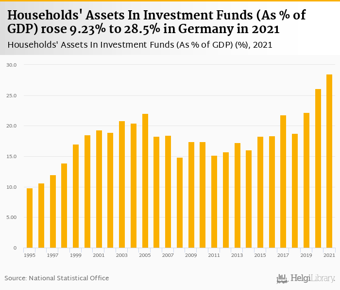 Households' assets in investment funds as of GDP rose 9.23% to 28.5% in Germany in 2021, according to OECD.