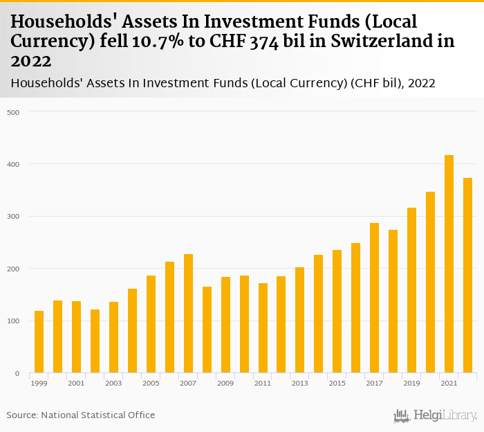 Households' assets in investment funds fell 10.7% to CHF 374 bil in Switzerland in 2022, according to OECD.