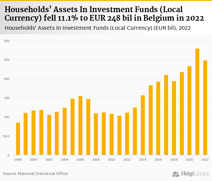 Historically, households' assets in investment funds in Belgium reached an all time high of EUR 279 bil in 2021 and an all time low of EUR 85.4 bil in 1998. When compared to Belgium's main peers, households' assets in investment funds in France amounted to EUR 322 bil, EUR 952 bil in Germany, EUR 14.9 bil in Luxembourg and EUR 99.3 bil in Netherlands in 2022.