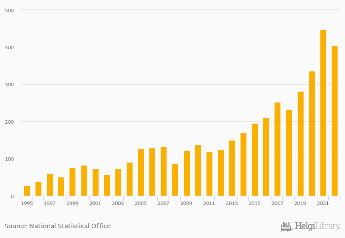 Historically, households' assets in investment funds in Norway reached an all time high of NOK 447 bil in 2021 and an all time low of NOK 26.9 bil in 1995.
