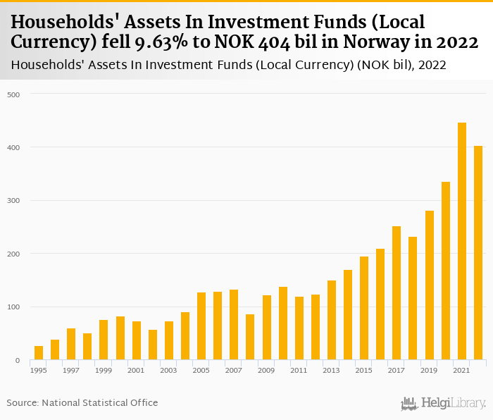 Households' assets in investment funds fell 9.63% to NOK 404 bil in Norway in 2022, according to OECD.