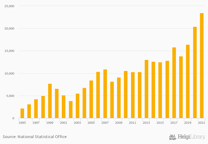 Historically, households' assets in investment funds per capita in Sweden reached an all time high of USD 23,498 in 2021 and an all time low of USD 2,215 in 1995.