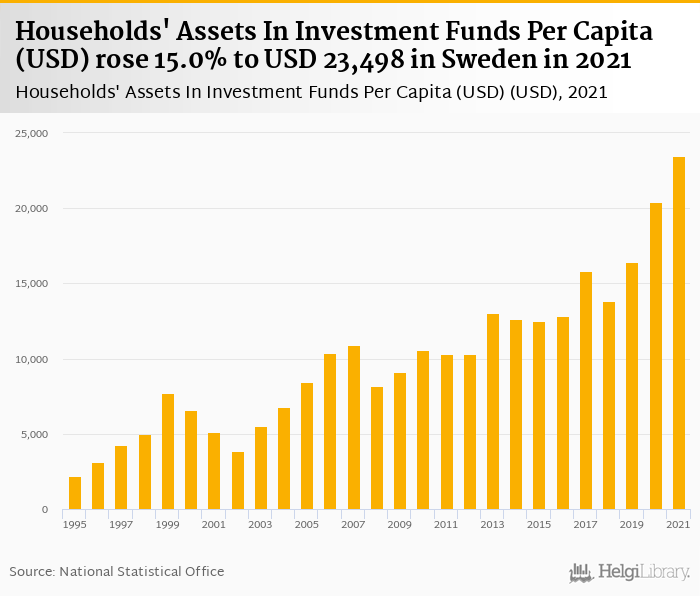 Households' assets in investment funds per capita rose 15.0% to USD 23,498 in Sweden in 2021, according to OECD.