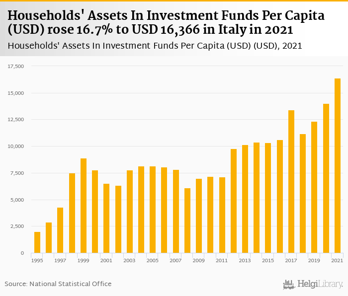Households' assets in investment funds per capita rose 16.7% to USD 16,366 in Italy in 2021, according to OECD.