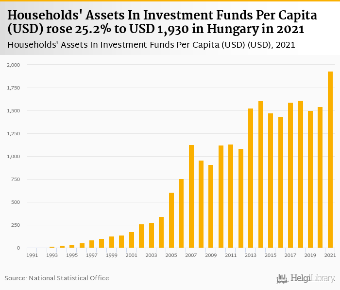 Households' assets in investment funds per capita rose 25.2% to USD 1,930 in Hungary in 2021, according to OECD.