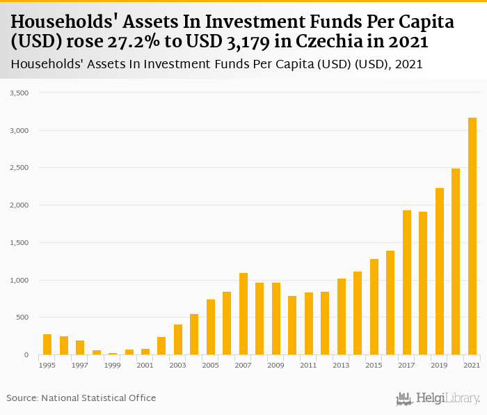 Households' assets in investment funds per capita rose 27.2% to USD 3,179 in Czechia in 2021, according to OECD.