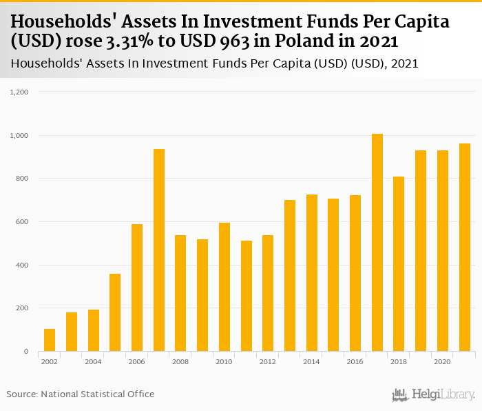 Households' assets in investment funds per capita rose 3.31% to USD 963 in Poland in 2021, according to OECD.