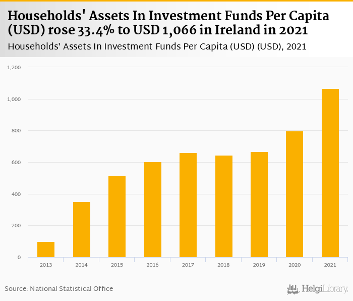 Households' assets in investment funds per capita rose 33.4% to USD 1,066 in Ireland in 2021, according to OECD.