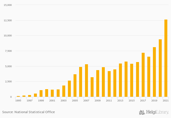 Historically, households' assets in investment funds per capita in Finland reached an all time high of USD 12,641 in 2021 and an all time low of USD 150 in 1995.