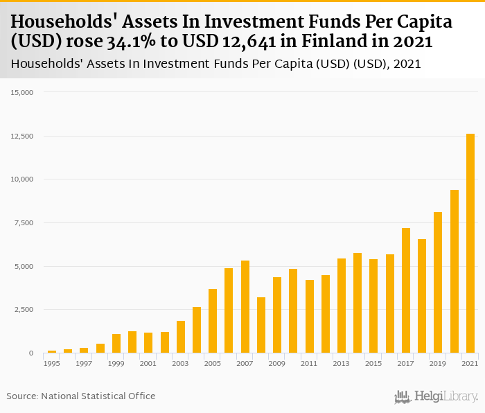 Households' assets in investment funds per capita rose 34.1% to USD 12,641 in Finland in 2021, according to OECD.