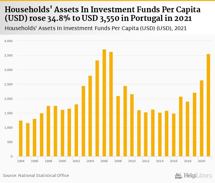 Households' assets in investment funds per capita rose 34.8% to USD 3,550 in Portugal in 2021, according to OECD.
