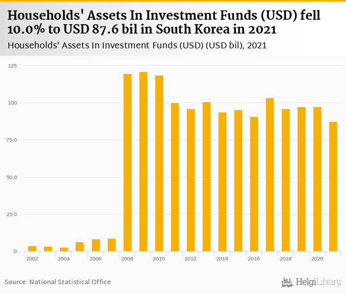 Households' assets in investment funds fell 10.0% to USD 87.6 bil in South Korea in 2021, according to OECD.