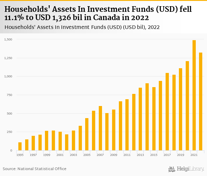 Households' assets in investment funds fell 11.1% to USD 1,326 bil in Canada in 2022, according to OECD.
