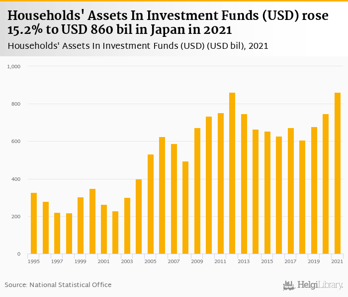 Historically, households' assets in investment funds in Japan reached an all time high of USD 862 bil in 2012 and an all time low of USD 218 bil in 1998.