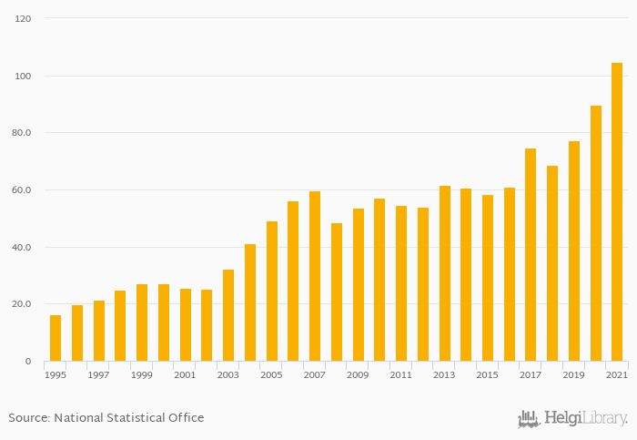 Historically, households' assets in investment funds in Austria reached an all time high of USD 105 bil in 2021 and an all time low of USD 16.2 bil in 1995. When compared to Austria's main peers, households' assets in investment funds in Germany amounted to USD 1,230 bil, USD 18.4 bil in Hungary, USD 983 bil in Italy and USD 468 bil in Switzerland in 2021.