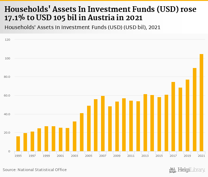Households' assets in investment funds rose 17.1% to USD 105 bil in Austria in 2021, according to OECD.