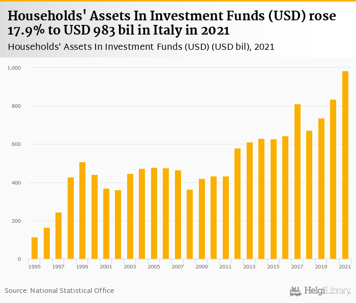Households' assets in investment funds rose 17.9% to USD 983 bil in Italy in 2021, according to OECD.