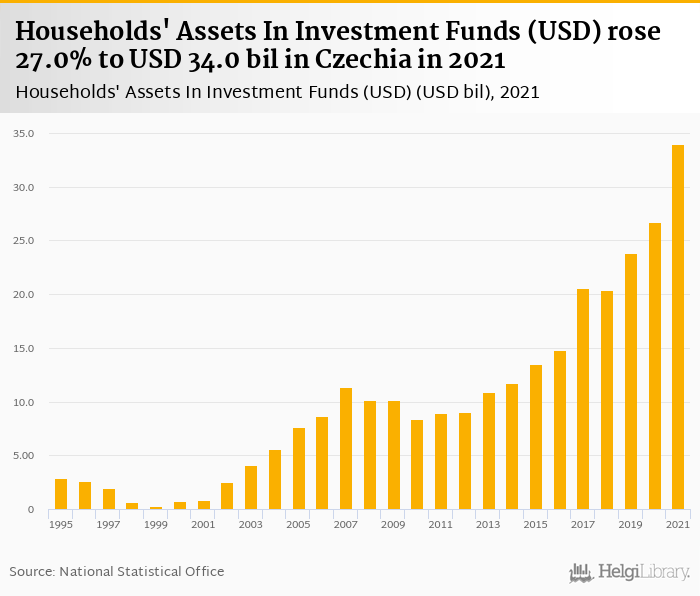 Households' assets in investment funds rose 27.0% to USD 34.0 bil in Czechia in 2021, according to OECD.